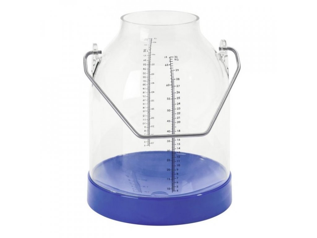 Konev na dojení, 30 l, s dvojí stupnicí a kovovým držadlem o objemu 30 litrů.