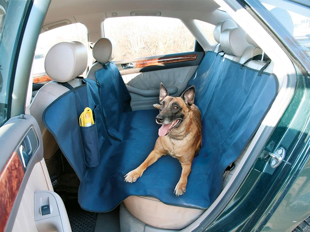 Ochranná deka do auta, pro psy všech velikostí, pro sedačky s opěrkami hlavy, 2 otvory pro bezpečnostní pásy, z nylonu, barva tmavě modrá, s cestovní láhví na vodu, objem láhve 500ml, rozměry 1,4x1,5m.
