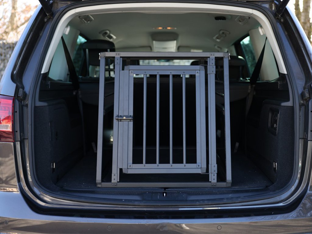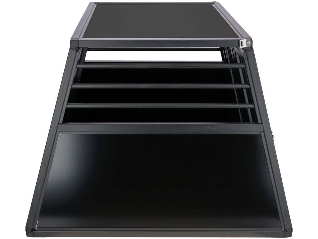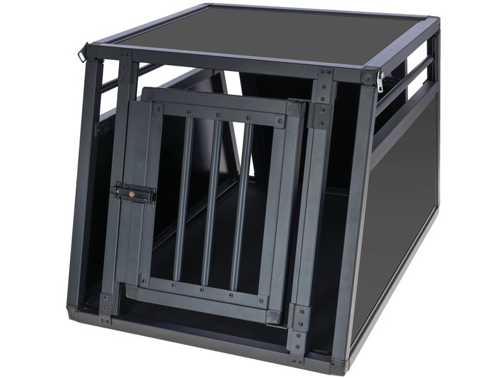 Přepravní klec pro psy, pevný a bezpečný hliníkový box do auta, dveře se rychloupínacím systémem, dobrá cirkulace vzduchu a viditelnost, protiskluzový teplený koberec z pryže, pro optimální usazení, snadná údržba a montáž, rozměry 77x55x50cm.