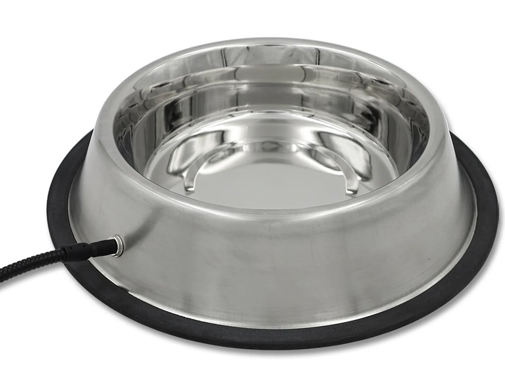 Vyhřívaná miska pro psy proti zamrzání pitné vody, nerezová, s objemem 1,8 l, s protiskluzovým gumovým lemem, s příkonem 15 W a napětím 12 V, napájecí kabel v ochranném krytu, třída ochrany proti vodě IP 65