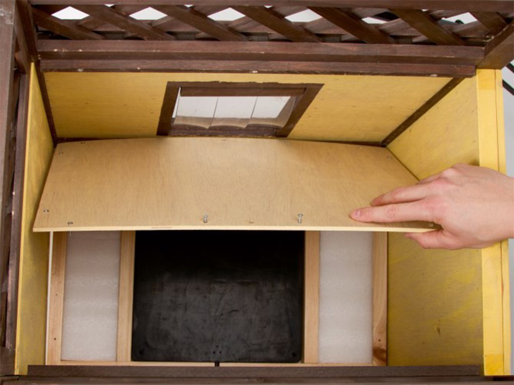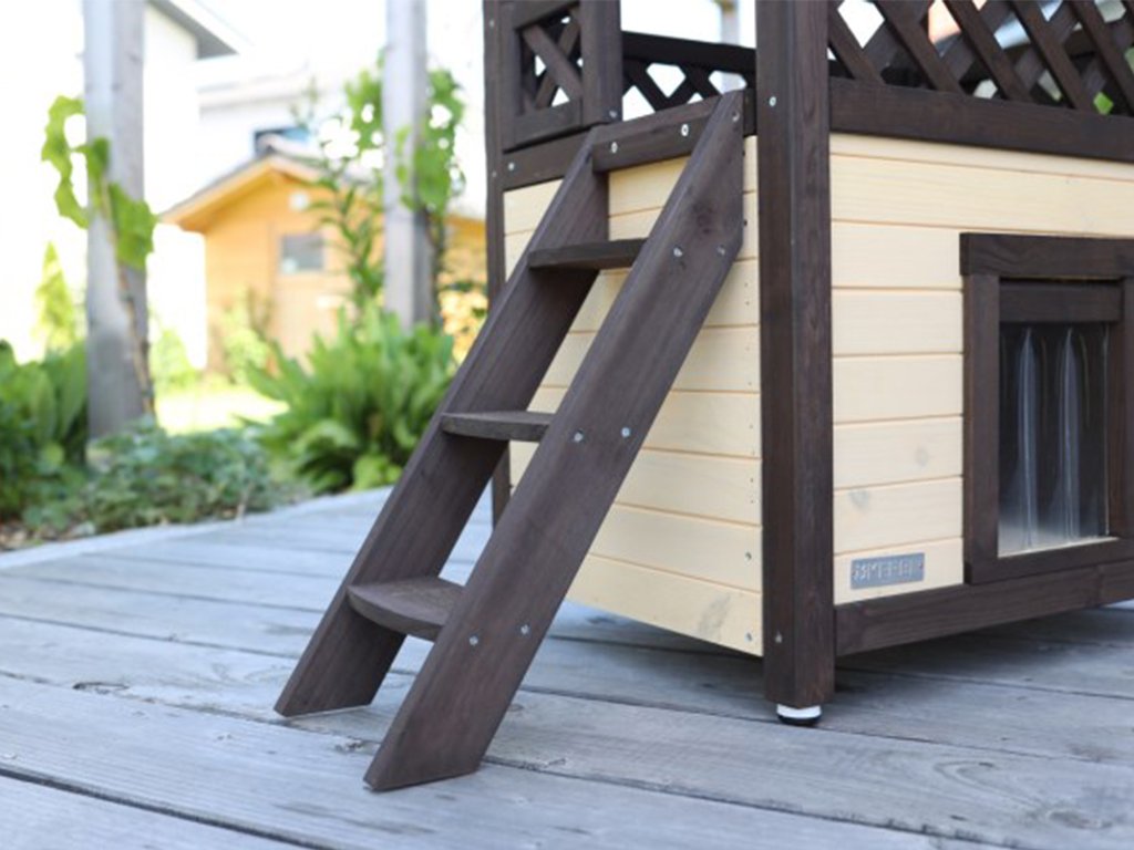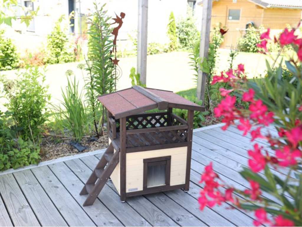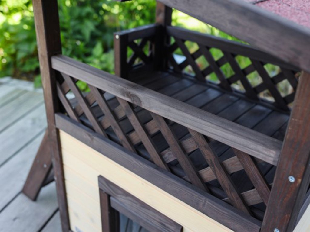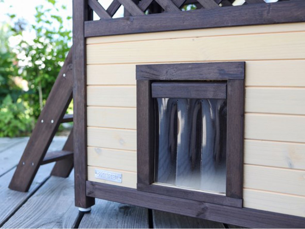 Domeček pro kočky zajišťuje bezpečné a klidné prostředí pro Vaši kočku. Nad domkem je umístěna krytá terasa, na kterou mají mazlíčci snadný přístup přes dřevěné schůdky. Dvířka jsou opatřena průhlednými lamelami, které kočku chrání uvnitř boudy proti větru a chladu. Pod podlahou domečku je nachystaný prostor pro topnou desku, kterou lze dokoupit a jednoduše nainstalovat.