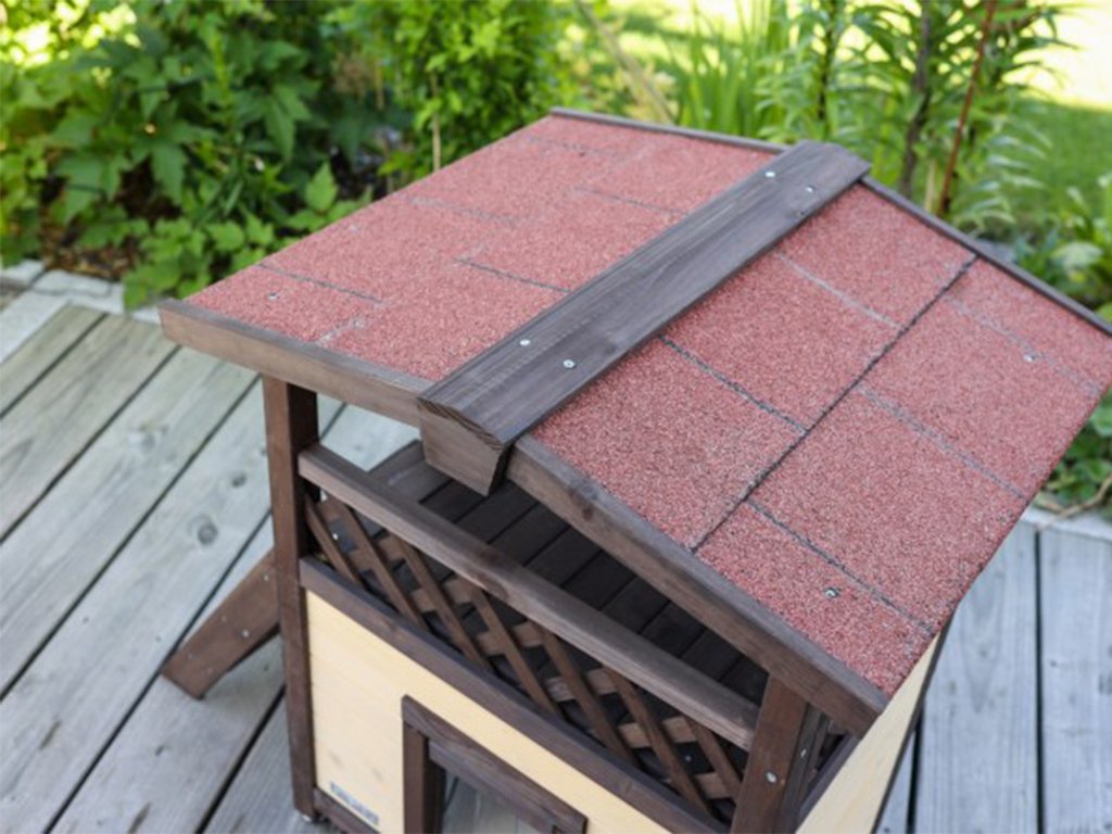 Bouda pro kočky vyrobena ze dřeva je tepelně izolována. Izolaci zajišťují dvojité stěny vyplněné styrofoamem. Střecha domku je pokryta ochranným nepromokavým bitumenovým materiálem. Přesto doporučujeme boudu umístit pod přístřešek, aby byla chráněna před deštěm, sněhem a slunečním záření. Dřevěný domek je povrchově ošetřen základním ochranným nátěrem. Pro delší životnost je třeba, jako u každého dřeva, ochranný nátěr obnovovat.