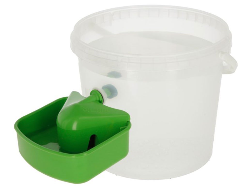Automatická napáječka pro drůbež, k montáži na kbelík, barel nebo nádrž, plastový materiál, O hrdla 12 mm, V 300 ml, rozměry 15x11x7 cm.