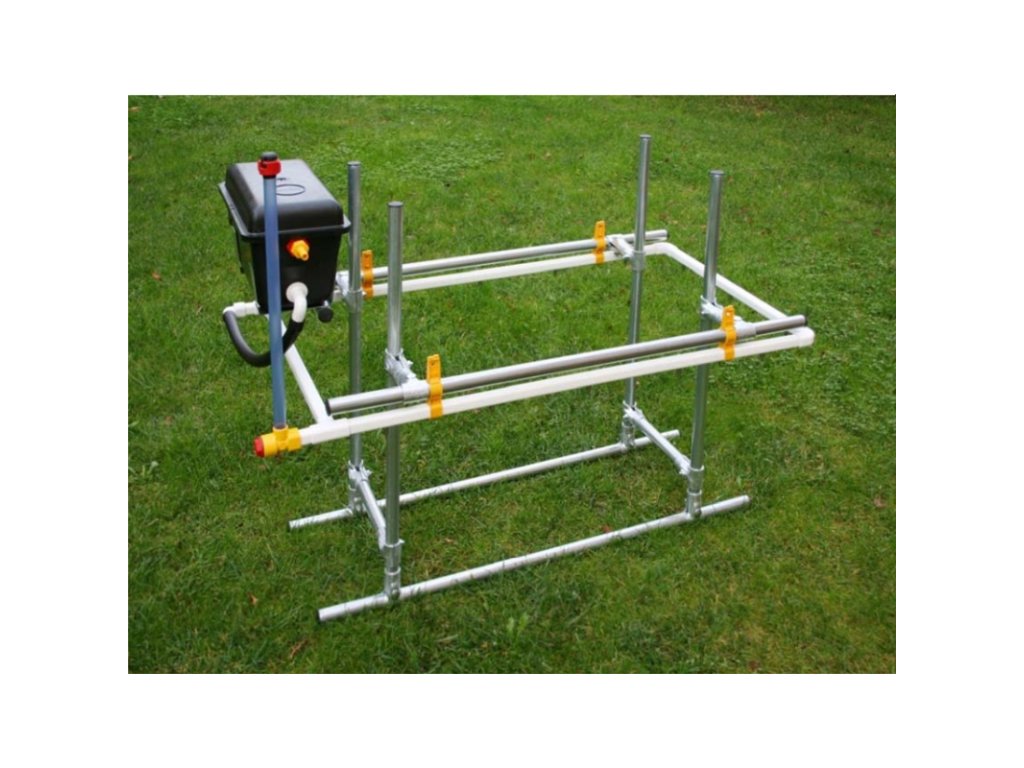 Napáječku tvoří pozinkovaná výškově nastavitelná konstrukce. Na tuto konstrukci je připevněno potrubí s niply. Celý tento systém je napojen na nádrž s ventilem, která je namontována na boční straně. Tato nádrž je dále napojena na zahradní hadici.