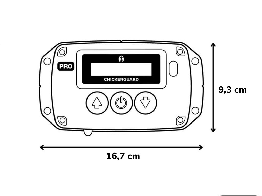 Chicken Guard Pro Solar má velice výkonný motor, který dokáže zvednout až 2 kg, takže je ideální pro otevírání větších a těžších dvířek. Přístroj je vybaven velice odolným pouzdrem, a tak zajišťuje perfektní ochranu při extrémních povětrnostních podmínkách až do teploty -20°C. Všechny potřebné informace o nastavení jsou přehledně znázorněny na LCD displeji. LCD displej přejde po určité době nečinnosti do "režimu spánku", aby se zvýšila životnost displeje. Zařízení znovu "probudíte" stisknutím tlačítka MENU. Pro nastavování programů slouží extra velká tlačítka, aby bylo možné je ovládat i v rukavicích.