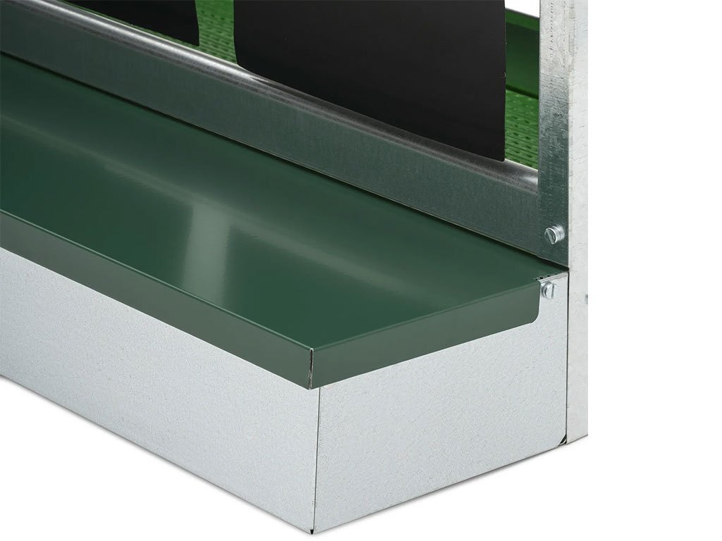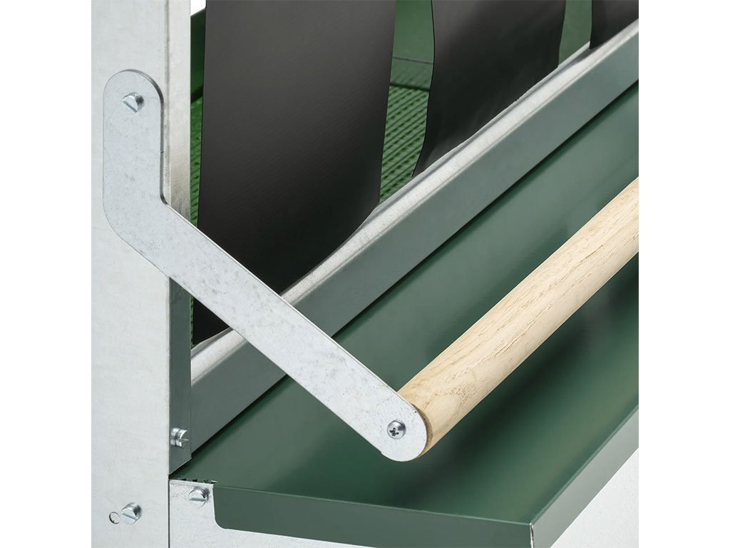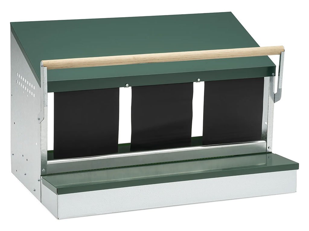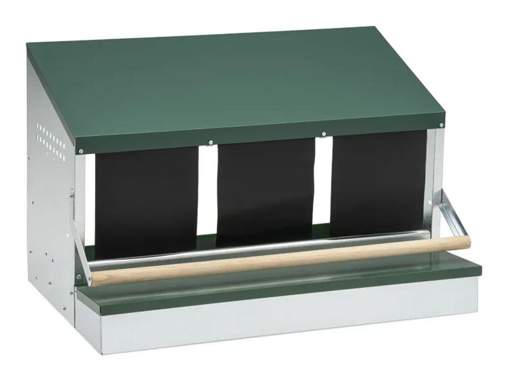 Snáškové hnízdo pro slepice s bidlem a sběrným košíkem, trojmístné, kapacita až 15 nosnic (5 nosnic na jednu kukaň), vyrobené z odolného kovu a plastu, barva zelená. Hnízdo můžete jednoduše postavit v kurníku na zem nebo zavěsit na zeď, velice snadná údržba čistoty, rozměry: 51,5 cm délka x 79,8 cm šířka x 51 cm výška.