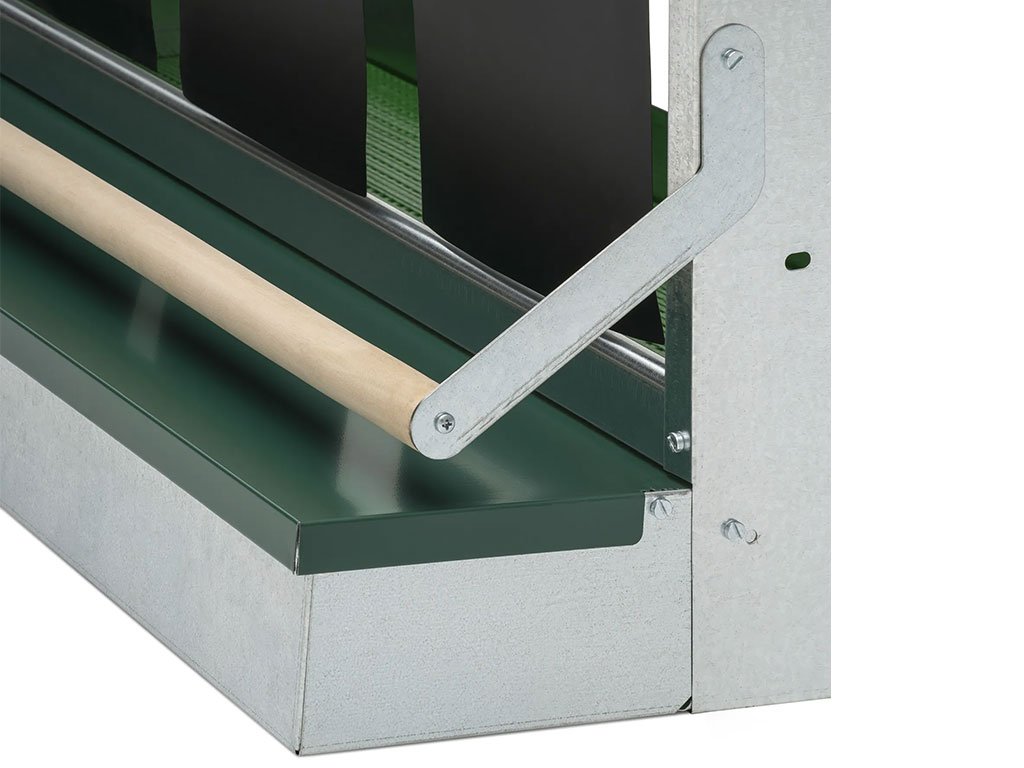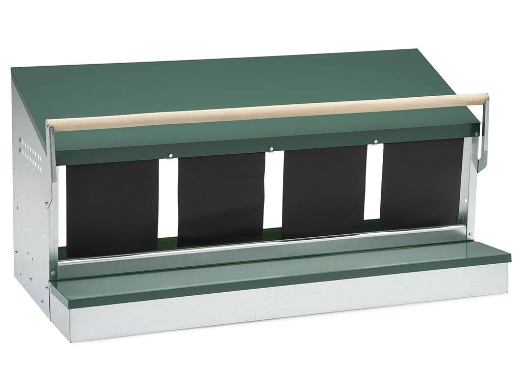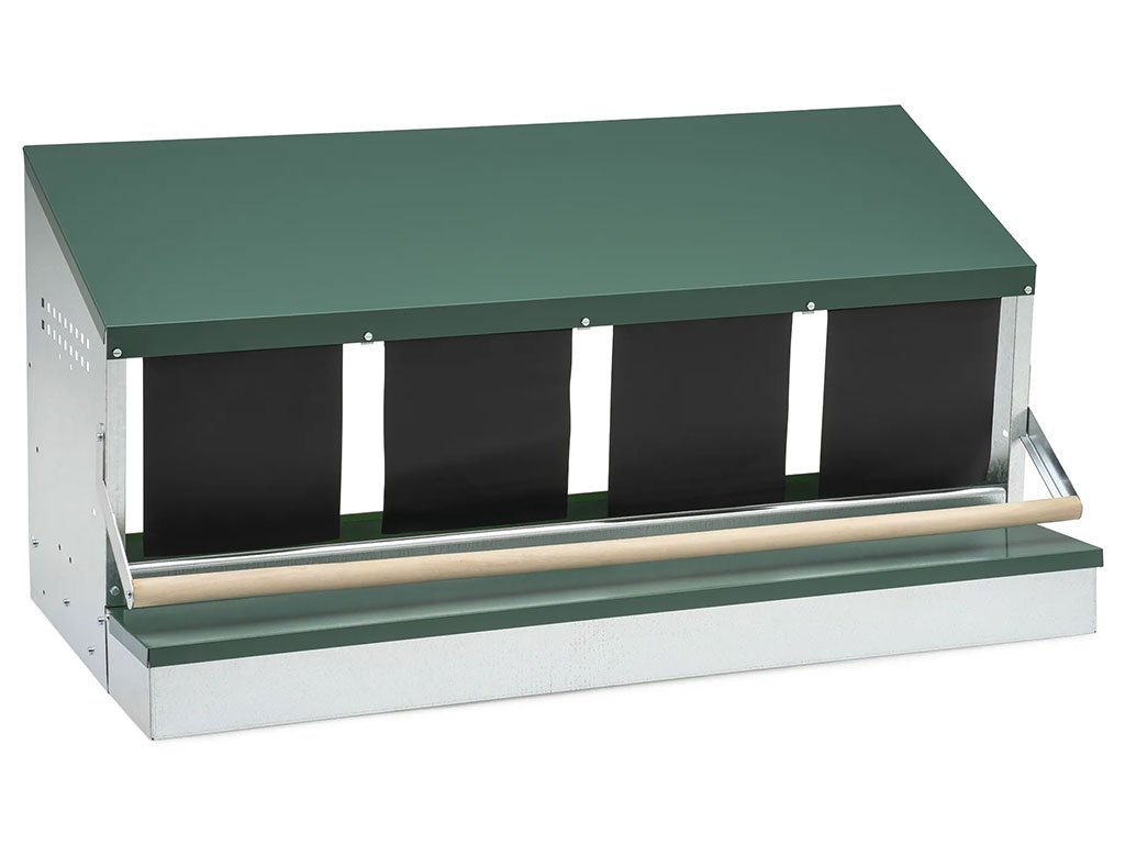 Snáškové hnízdo pro slepice s bidlem a sběrným košíkem, čtyřmístné, kapacita až 20 nosnic (5 nosnic na jednu kukaň), vyrobené z odolného kovu a plastu, barva zelená. Hnízdo můžete jednoduše postavit v kurníku na zem nebo zavěsit na zeď, velice snadná údržba čistoty, rozměry: 51,5 cm délka x 106 cm šířka x 51 cm výška.