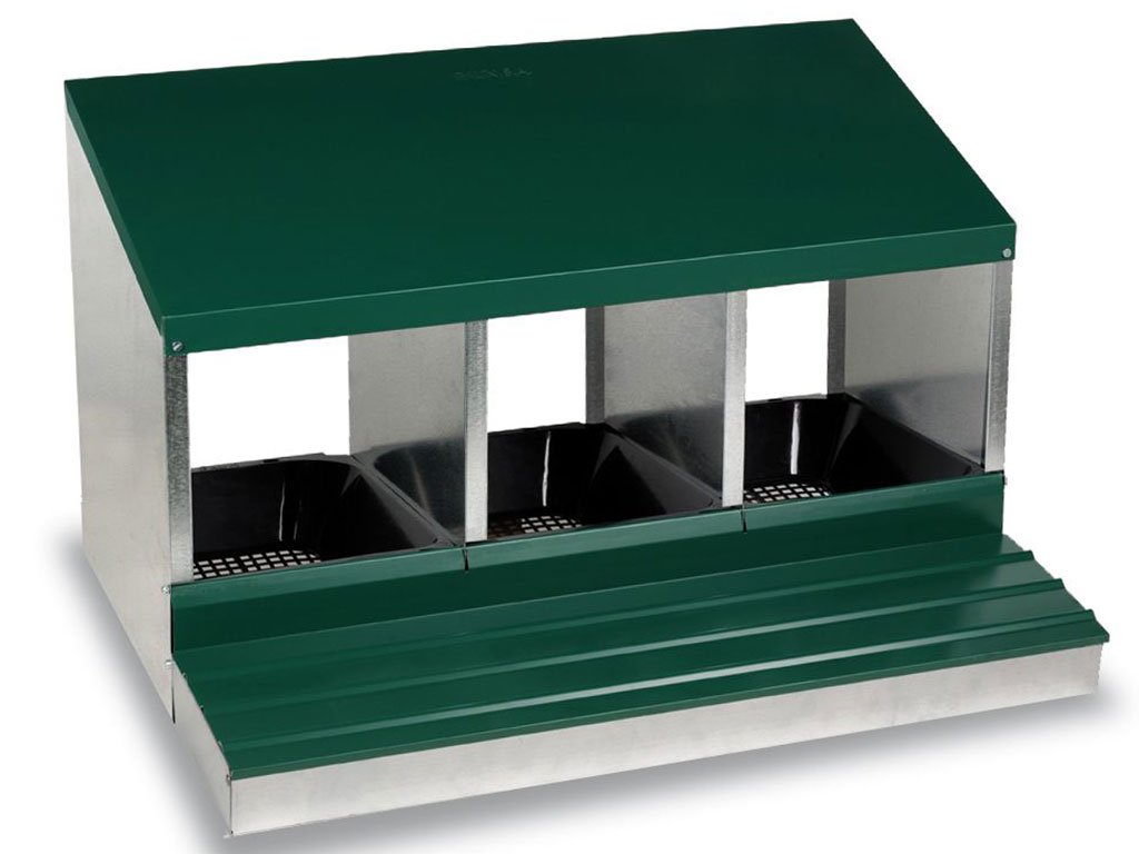 Snáškové hnízdo pro slepice se sběrným košíkem na vejce trojmístné, kapacita až 15 nosnic (5 nosnic na jednu kukaň), dno hnízda je spádované, vejce se samo odkutálí do sběrného košíku, vyrobené z pozinkovaného kovu, barva zelená. Hnízdo můžete jednoduše postavit v kurníku na zem nebo zavěsit na zeď, velice snadná údržba čistoty, rozměry: 56 cm délka x 80 cm šířka x 45,5 cm výška.