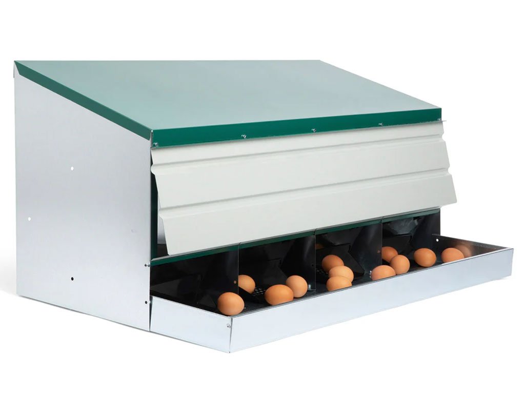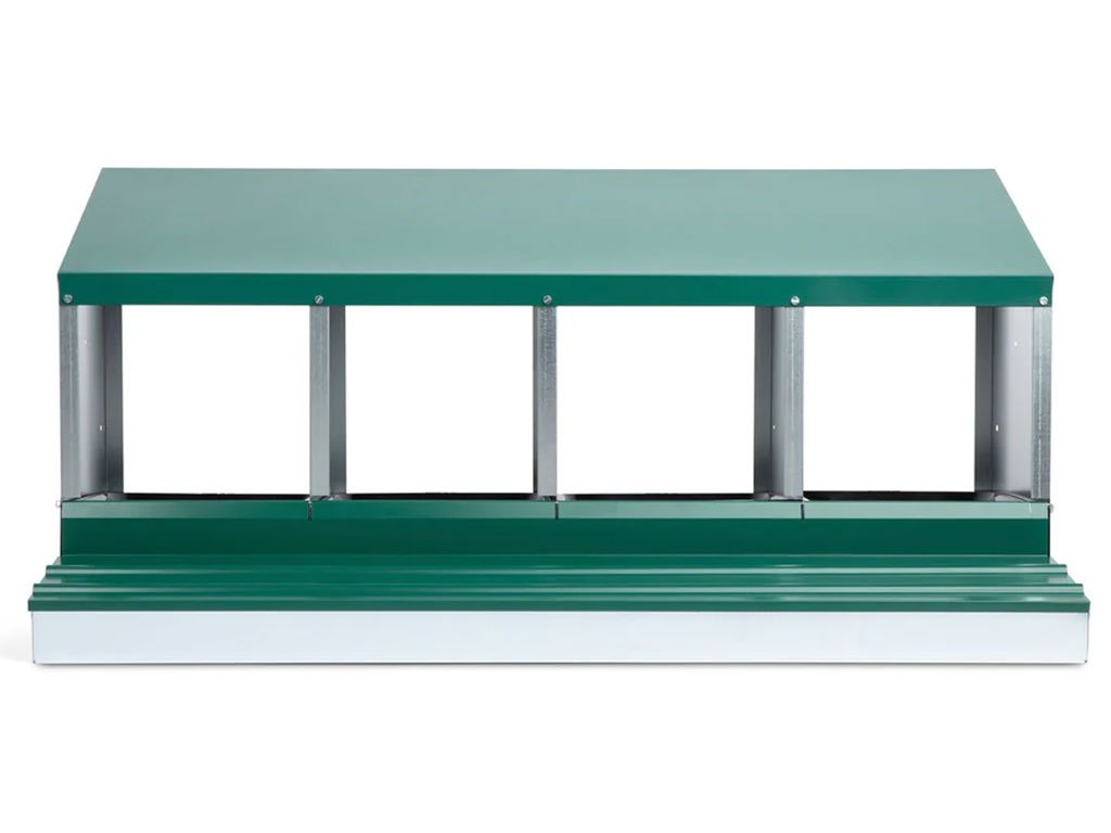 Snáškové hnízdo pro slepice se sběrným košíkem na vejce čtyřmístné, kapacita až 20 nosnic (5 nosnic na jednu kukaň), dno hnízda je spádované, vejce se samo odkutálí do sběrného košíku, vyrobené z pozinkovaného kovu, barva zelená. Hnízdo můžete jednoduše postavit v kurníku na zem nebo zavěsit na zeď, velice snadná údržba čistoty, rozměry: 56 cm délka x 106,3 cm šířka x 45,5 cm výška.