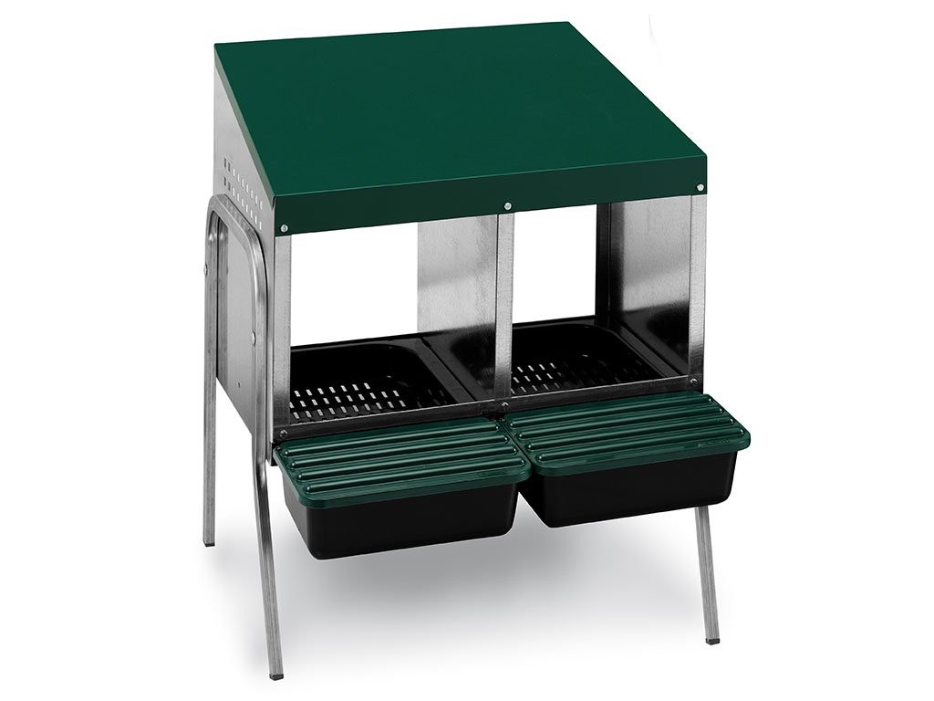 Snáškové hnízdo pro slepice se sběrným košíkem na vejce dvoumístné na nožičkách, kapacita až 10 nosnic (5 nosnic na jednu kukaň), dno hnízda je spádované, vejce se samo odkutálí do sběrného košíku, vyrobené z pozinkovaného kovu s plastovým dnem, barva zelená. Hnízdo můžete jednoduše postavit v kurníku na zem díky nožičkám, velice snadná údržba čistoty, rozměry: 57,2 cm délka x 52 cm šířka x 66,5 cm výška.