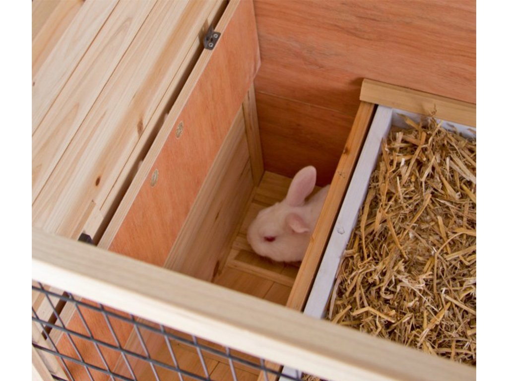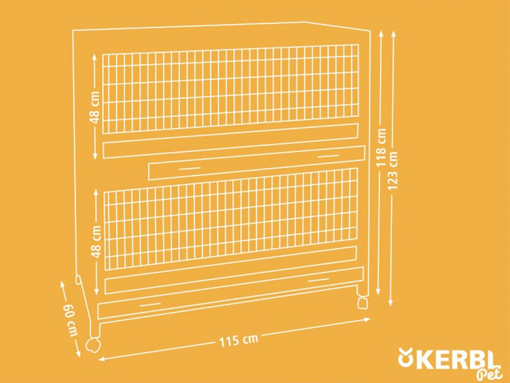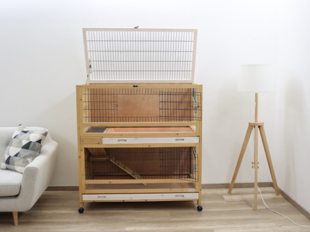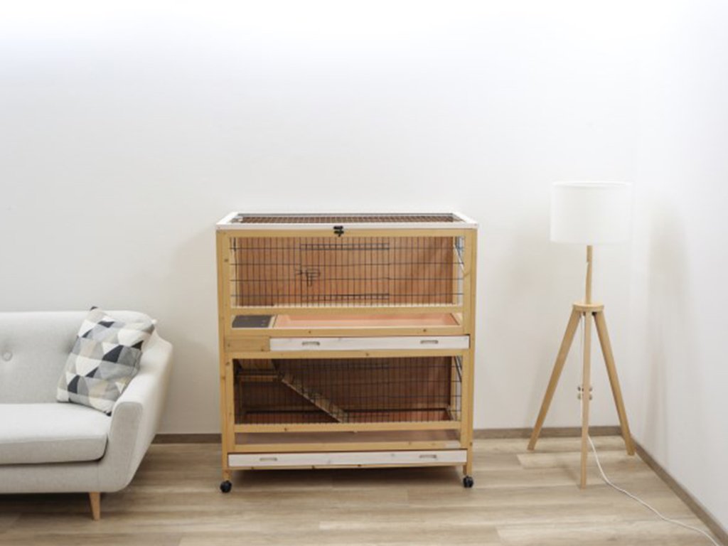 Stylová dvoupatrová klec pro králíky, morčata a jiné hlodavce o rozměrech 115x60x118 cm pro interiérové použití. Jedná se o perfektní dřevěnou klec, která je vybavena vyjímatelnými trusníky pro snadné čistění a dvěma patry, jejichž průchod lze uzavřít. Klec je umístěna na čtyřech nohách s brzdou pro snadnější manipulaci.