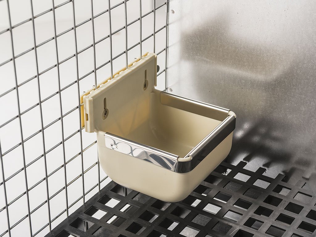 Pozinkovaná klec pro králíky, plastový podlahový rošt, vysouvatelný trusník, napáječka a krmítko, rozměry 56x41x57cm.