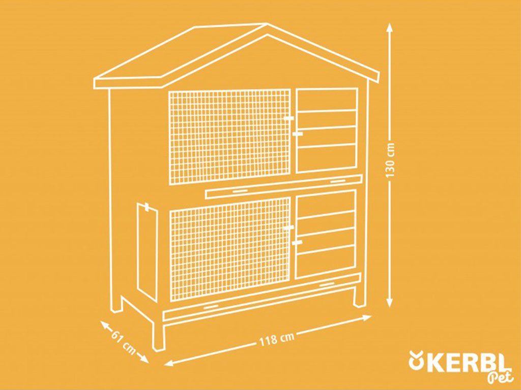 Vnější rozměry celé králíkárny jsou 118 x 61 x 130 cm, výška spodního patra je 50 cm, výška v horním patře je 59 cm. Dvoupatrová králíkárna poskytuje pohodlí pro dva králíky, zakrslé králíky, morčata nebo jiné malé hlodavce.