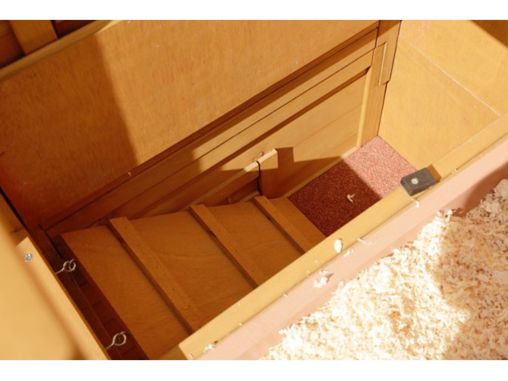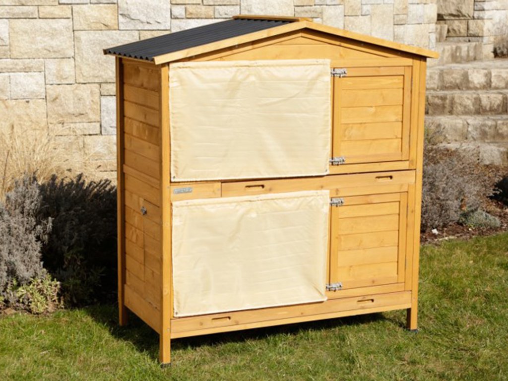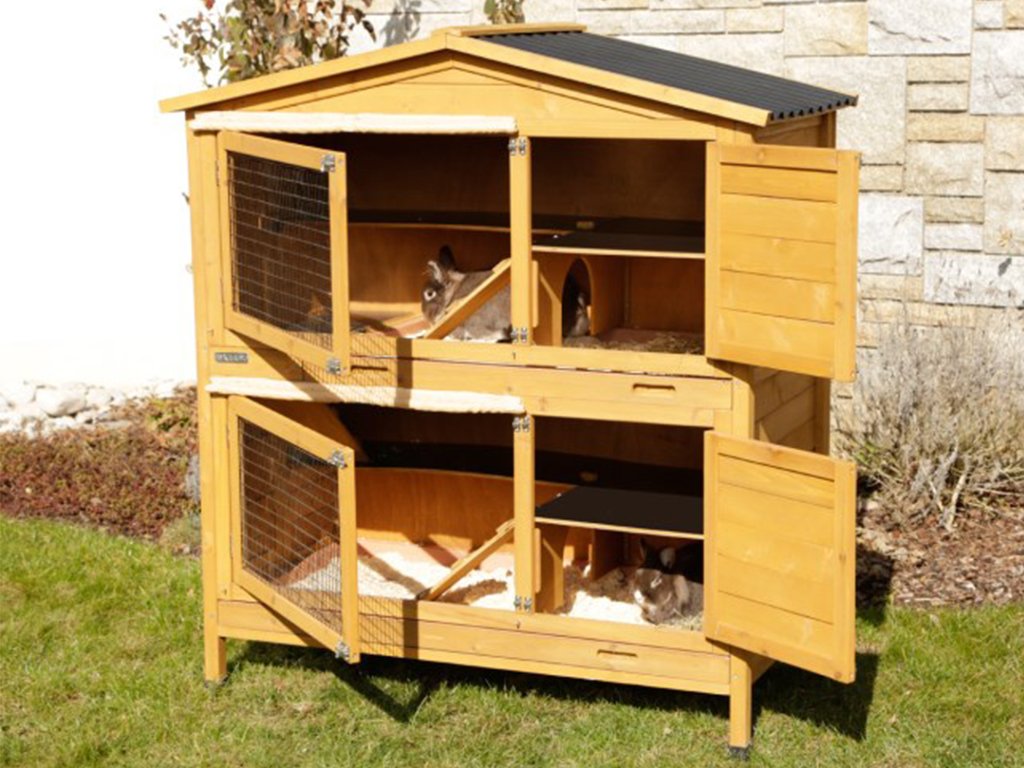 Mazlíčci budou mít v králíkárně dostatek prostoru a pohodlí. Králíci mohou odpočívat v menší části králíkárny, která jim nabídne příjemné soukromí a přítmí nebo ve větší prosvětlené části, která je vybavena pevnou mřížkou. Tato část s mřížkou je opatřena rolovací zástěnou pro ochranu před nepřízní počasí. Obě dvě patra králíkárny mohou být průchozí nebo je možné jednotlivá patra od sebe oddělit a uzavřít. Králíkárna má celkem čtyři samostatná přední dvířka, která jsou pro zvýšení bezpečnosti opatřeny druhým zámkem. Králíkárna je vybavena také bočními dvířky, kterými králíkovi můžete umožnit volný vstup do výběhu (výběh není součástí balení). Králíkárna je umístěna na čtyřech plastových nastavitelných nožkách.