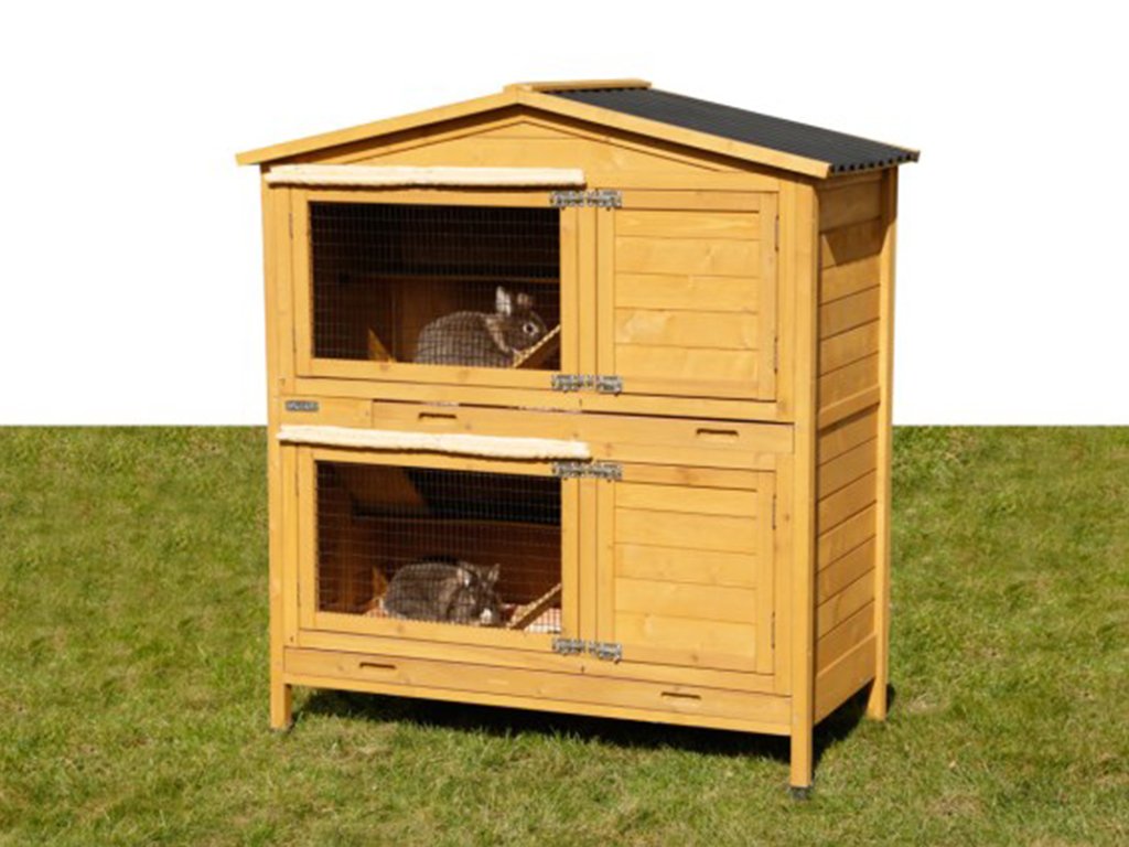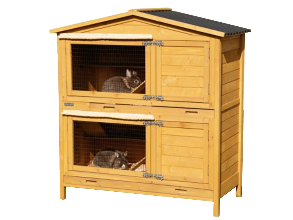 Dřevěná dvoupatrová králíkárna pro chov králíků a morčat o rozměrech 118 x 61 x 130 cm. Jedná se o perfektní králíkárnu, která je vybavena vyjímatelnými trusníky pro snadné čistění, odolnou plastovou střechou proti povětrnostním vlivům a dvěma patry, jejichž průchod lze uzavřít. Bezproblémový přístup do králíkárny zajišťují čtyři samostatná dvířka.