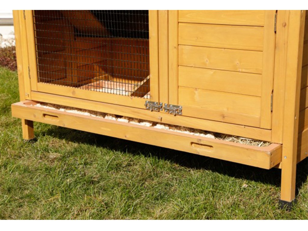 Čištění králíkárny zvládnete během pár minut. Práci velmi usnadní vyjímatelné trusníky o hloubce 5 cm umístěné v každém patře králíkárny, které stačí vysout, vyčistit a vrátit zpět.