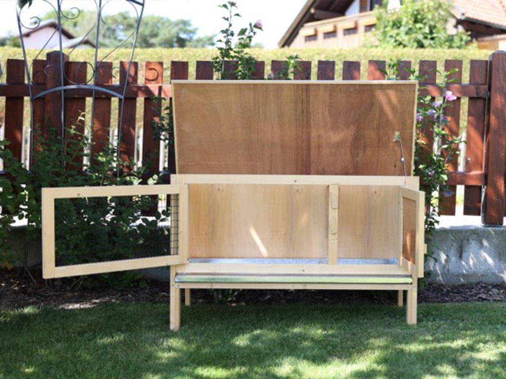 Čištění králíkárny zvládnete během pár minut. Práci velmi usnadní vyjímatelný pozinkovaný trusník, který stačí z králíkárny vysunout, vyčistit a vrátit zpět. Při údržbě králíkárny jistě oceníte také odklápěcí střechu.