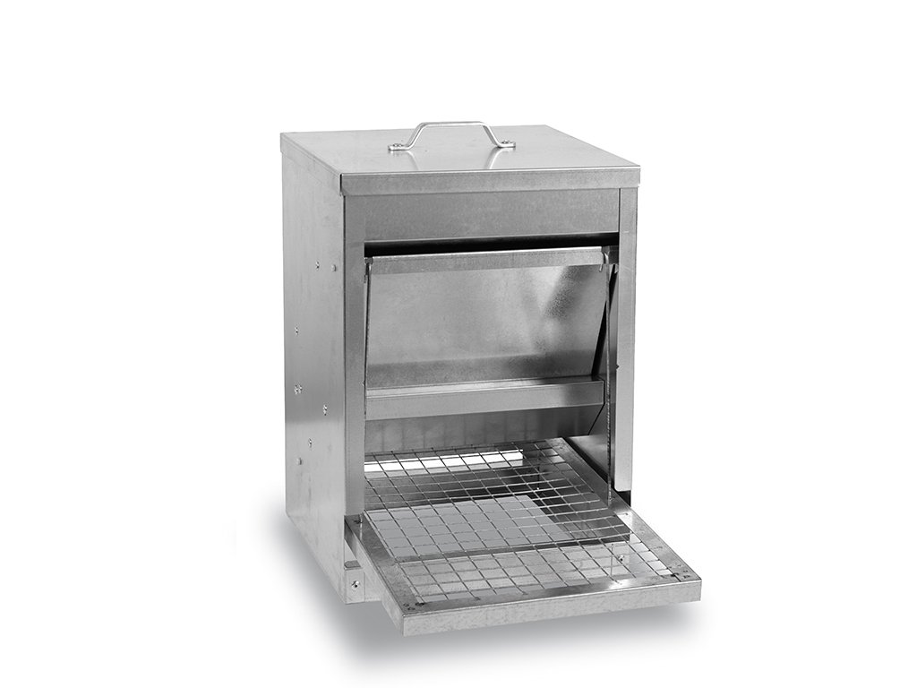S víkem, nášlapnou plošinou 5 kg zásobníkem do 15 slepic o rozměrech 280 x 415 x 385 mm.
