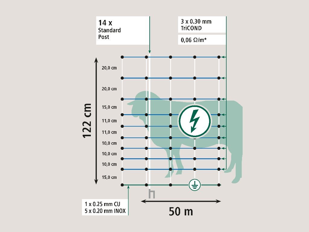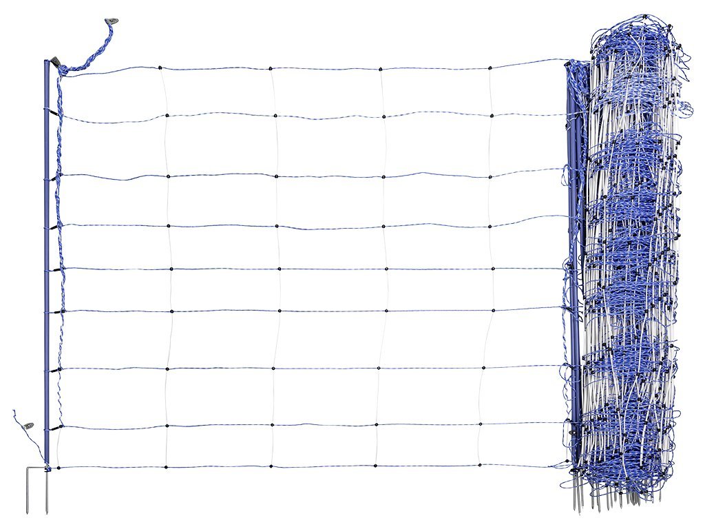Ohradníková vodivá síť pro ovce, kozy, pro konstrukci elektrického ohradníku, 9 vodorovných pramenů, vodič TriCond 3x0,30 mm s 5x vyšší vodivostí, 14 plastových tyček s dvojitým hrotem, pevně svařené spoje a odolné zarážky, účinná ochrana proti vlkům, výška 122 cm a délka 50 m.