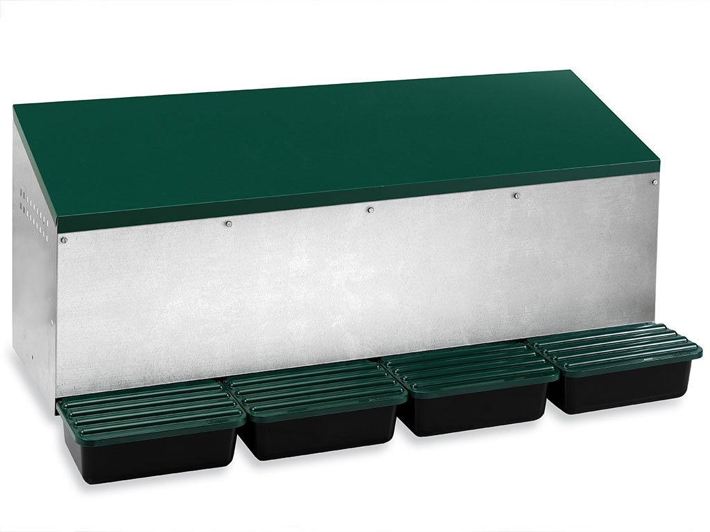 Venkovní snáškové hnízdo pro slepice se sběrným košíkem na vejce čtyřmístné, až pro 20 nosnic (5 nosnic na jednu kukaň), dno hnízda je spádované, vejce se samo odkutálí do sběrného košíku, vyrobené z pozinkovaného kovu s plastovým dnem, barva zelená. Jednoduché připevnění z vnější části kurníku, velice snadná údržba čistoty, rozměry: 48 cm délka x 106,1 cm šířka x 52 cm výška.