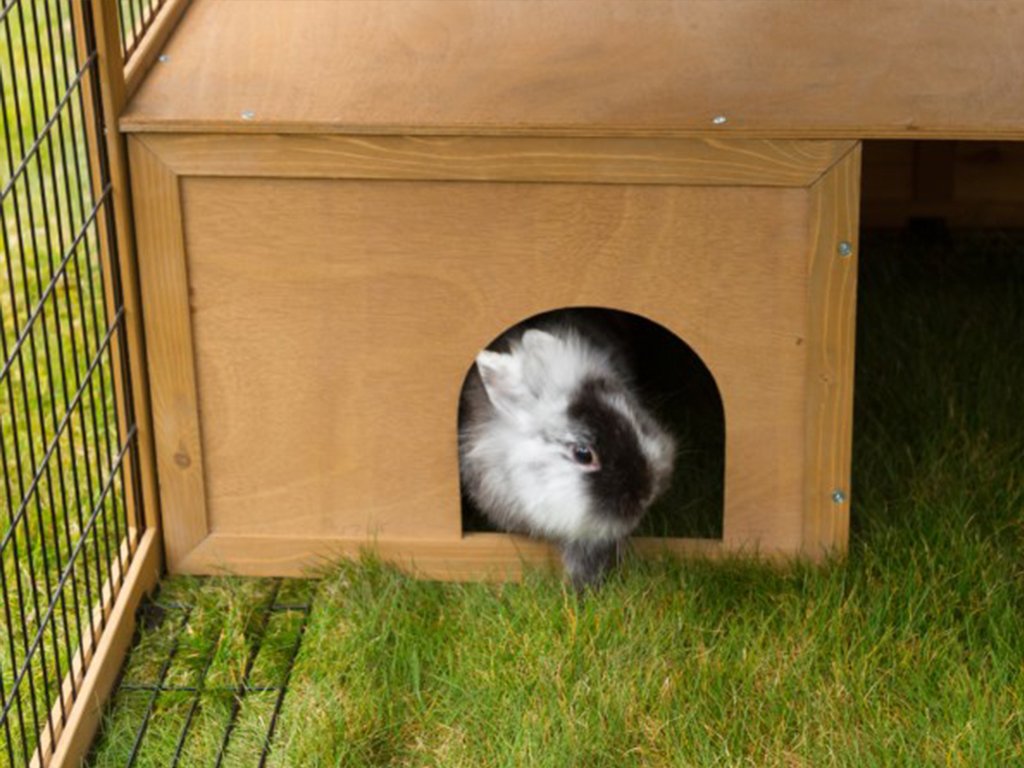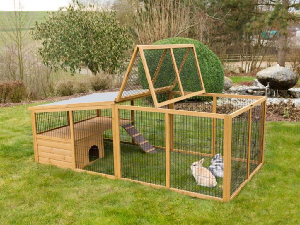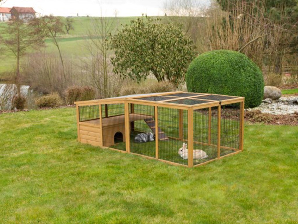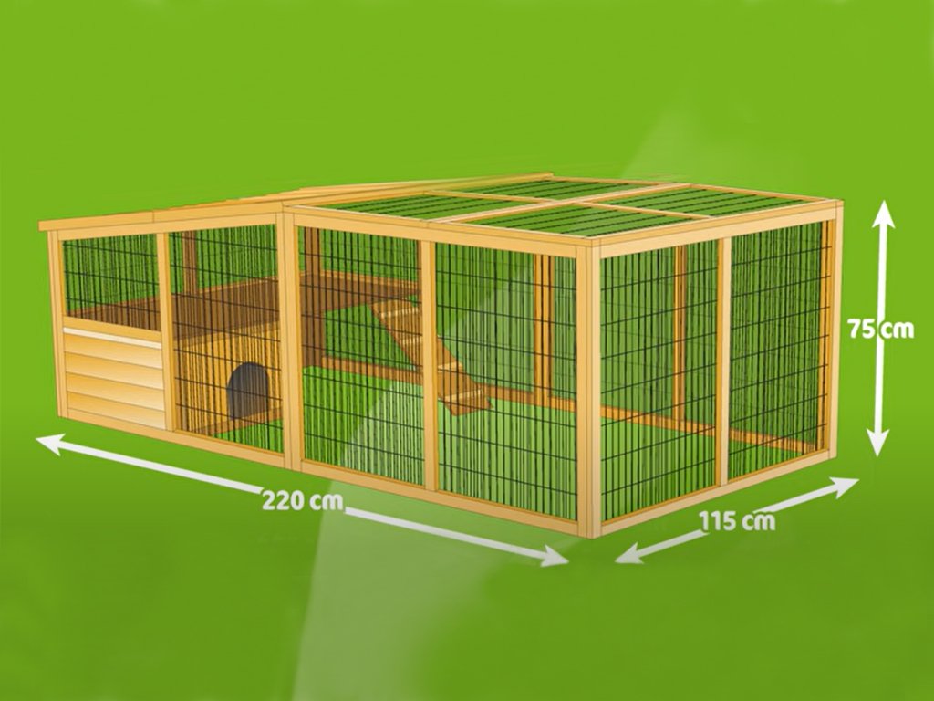 Výběh poskytne králíkům naprosté pohodlí a bezpečí, ale zároveň také volnost v přírodě. Králík může trávit čas v domečku, na vyvýšené odpočinkové plošině, na kterou má neustále přístup přes schůdky nebo ve volném výběhu na zelené trávě. Ke svému mazlíčkovi budete mít snadný přístup přes dvoje dvířka (jedny jsou u odpočinkového místa a druhé na čelní straně výběhu) a přes vrchní část výběhu, kterou můžete odklopit do několika poloh. Stěny a střecha výběhu zabraňuje vyskočení a nabízí ochranu před nezvanými hosty, jako jsou např. dravci, kočky nebo kuny. Nemusíte se bát, že se králík pod dřevěným výběhem podhrabe, jelikož po obvodu celého výběhu je z vnitřní části výběh chráněn pletivem.