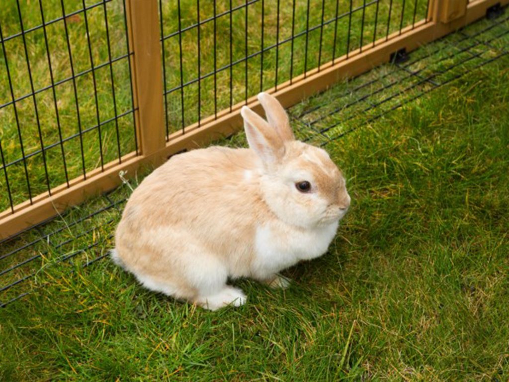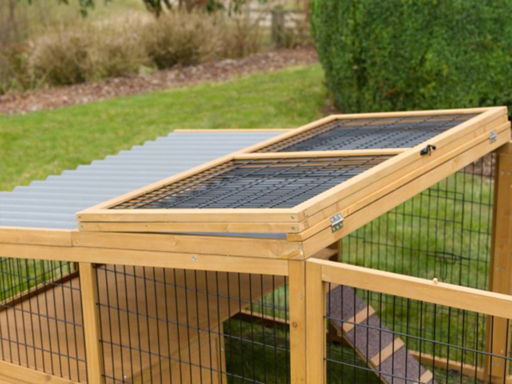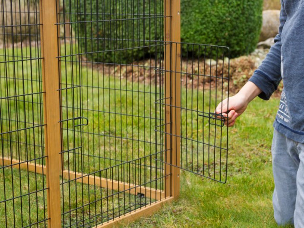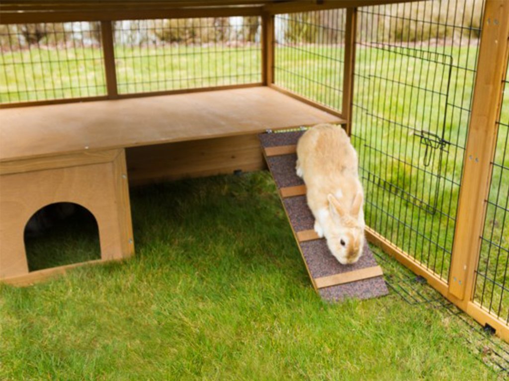 Výběh poskytne králíkům naprosté pohodlí a bezpečí, ale zároveň také volnost v přírodě. Králík může trávit čas v domečku, na vyvýšené odpočinkové plošině, na kterou má neustále přístup přes schůdky nebo ve volném výběhu na zelené trávě. Ke svému mazlíčkovi budete mít snadný přístup přes dvoje dvířka (jedny jsou u odpočinkového místa a druhé na čelní straně výběhu) a přes vrchní část výběhu, kterou můžete odklopit do několika poloh. Stěny a střecha výběhu zabraňuje vyskočení a nabízí ochranu před nezvanými hosty, jako jsou např. dravci, kočky nebo kuny. Nemusíte se bát, že se králík pod dřevěným výběhem podhrabe, jelikož po obvodu celého výběhu je z vnitřní části výběh chráněn pletivem.