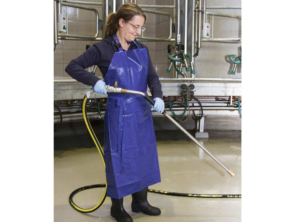 Zástěra na dojení a mytí, vhodná i pro zemědělské, domácí a zahradní práce, voděodolný materiál proti vlhkosti a vodě, extrémně odolná proti roztržení a prasknutí, vysoká teplotní odolnost -25°C až +70°C, praktické zapínání u krku přes nastavitelnou přezku, rozměr 125x125 cm.