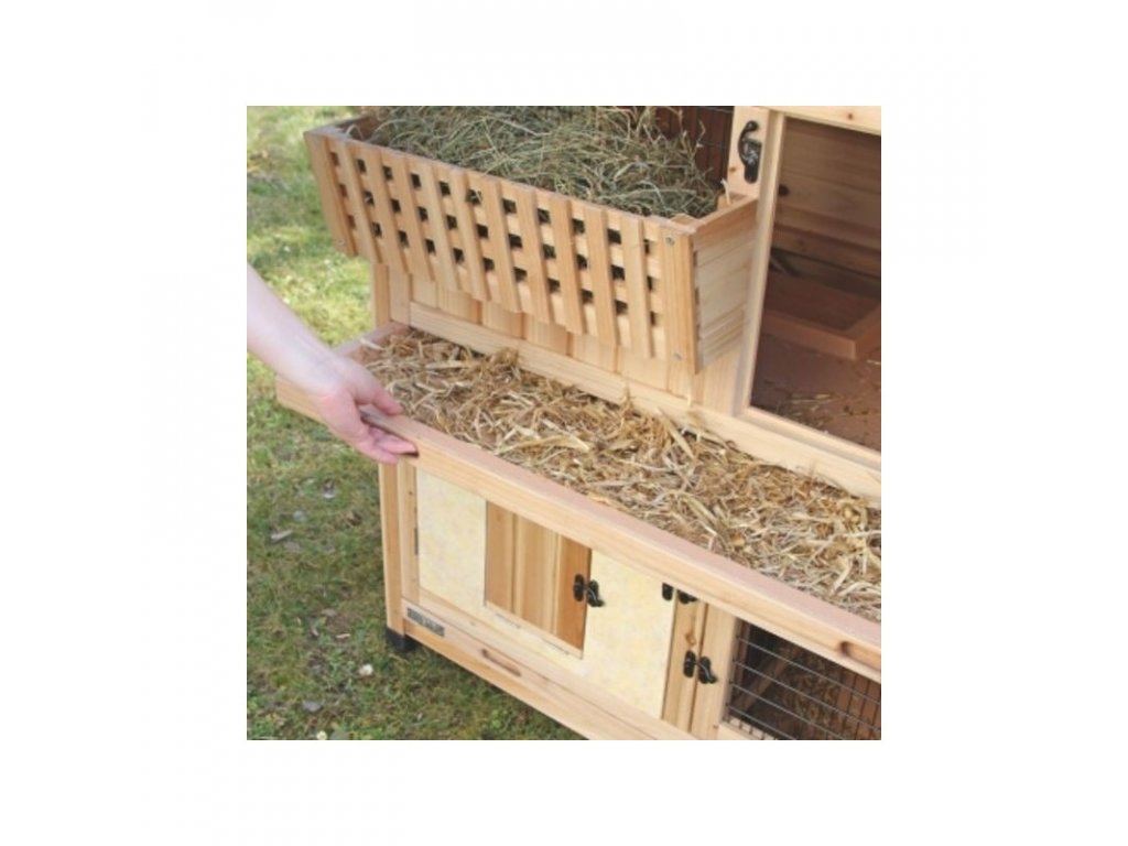 - V neposlední řadě pořiďte kvalitní seno, které se ukládá do praktických vnějších jeslí. Je nezbytných základem králíčího jídelníčku pro zdravé zuby a zažívání