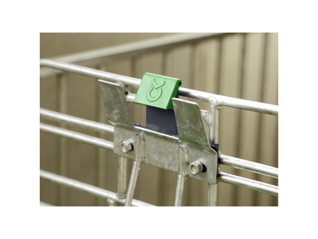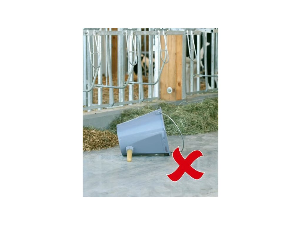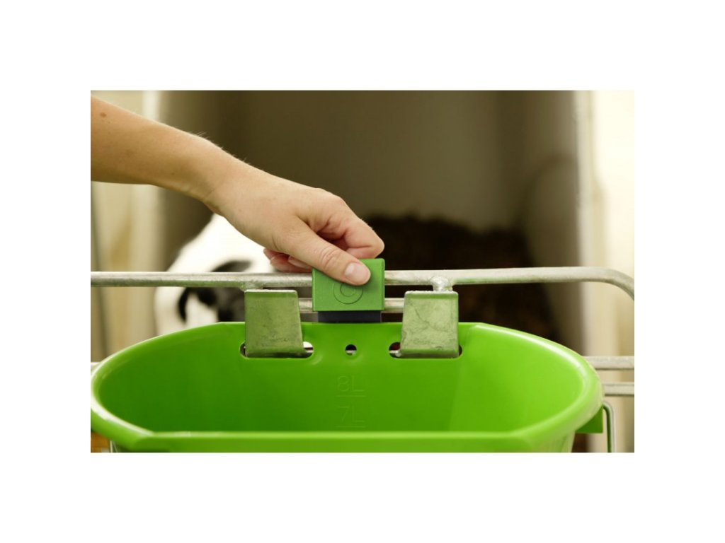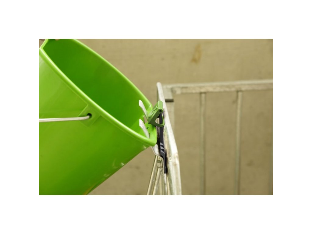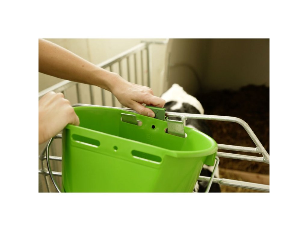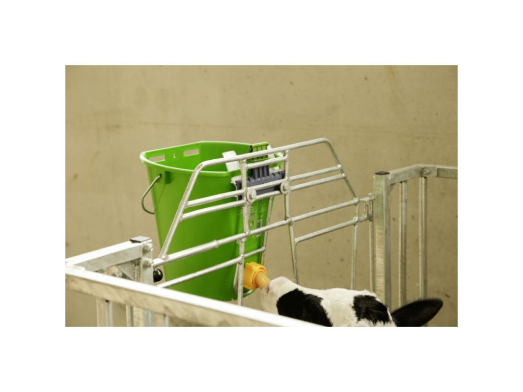 Zámek držáku na kbelík udržuje kbelík v poloze pro napájení, nedochází tedy k vyklopení kbelíku a vylitíí obsahu. Vhodný k montáži na ohrádku ke všem boudám pro telata.