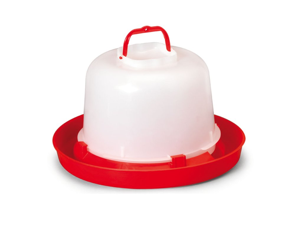 Klobouková napáječka pro drůbež s bajonetovým uzávěrem a držadlem k snadnému zavěšení. Lze vybrat variantu bez nožiček, nebo s nožičkami, kdy napáječka bude výše o 65 mm, čímž se sníží riziko znečištění vody.