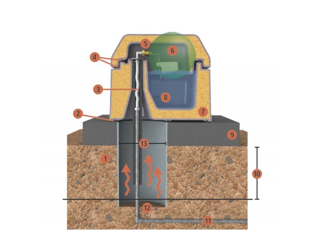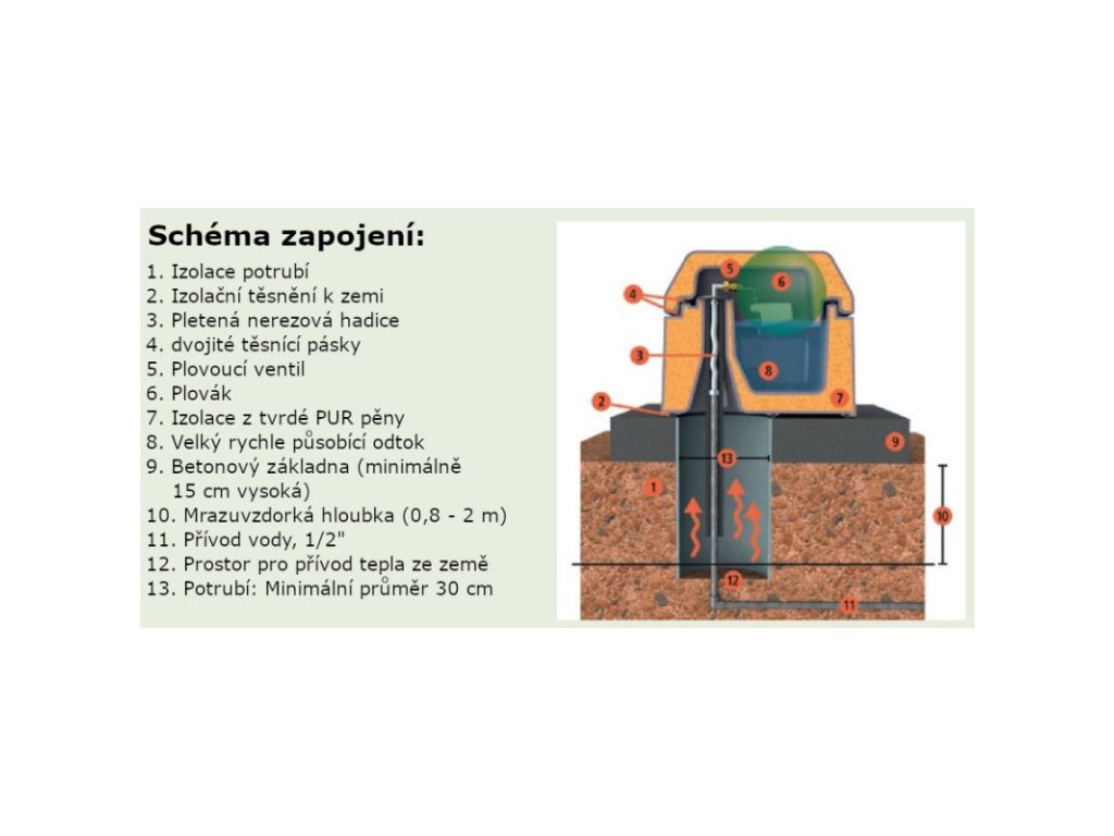 - 1/2”, spodní přívod vody (nutné vést v hloubce, kde půda nezamrzá)