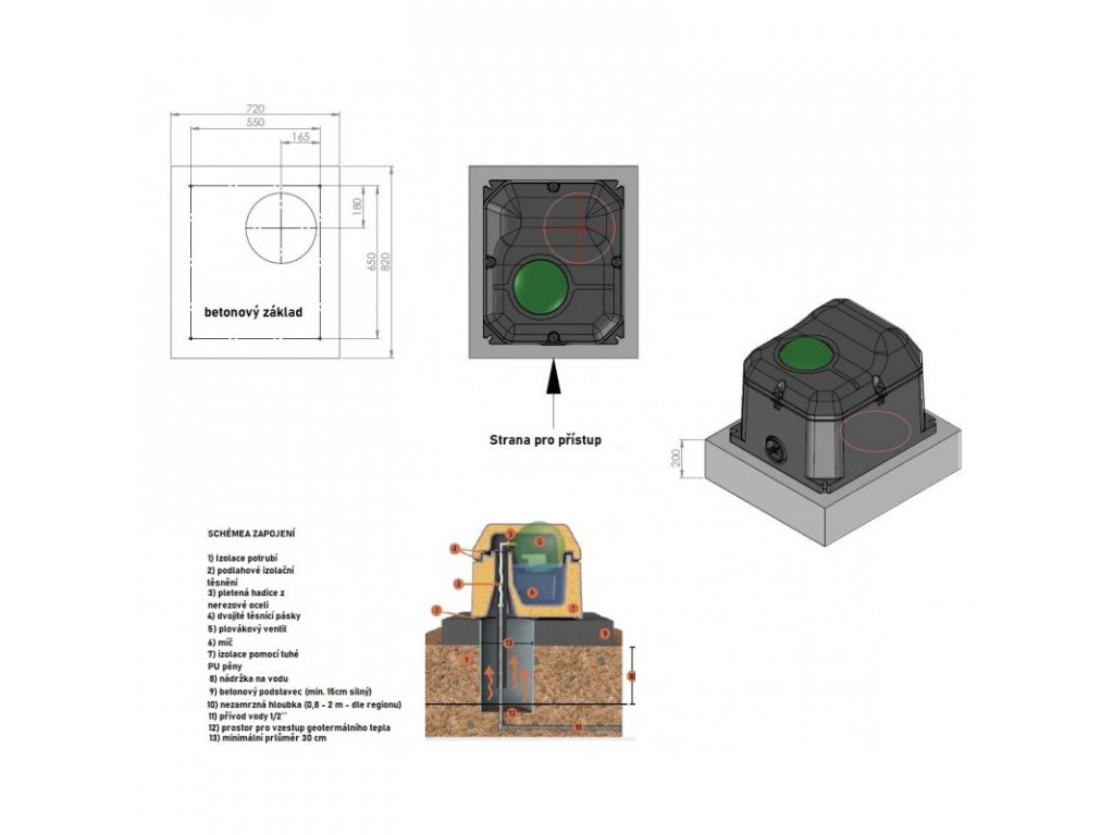 - 1/2”, spodní přívod vody (nutné vést v hloubce, kde půda nezamrzá)