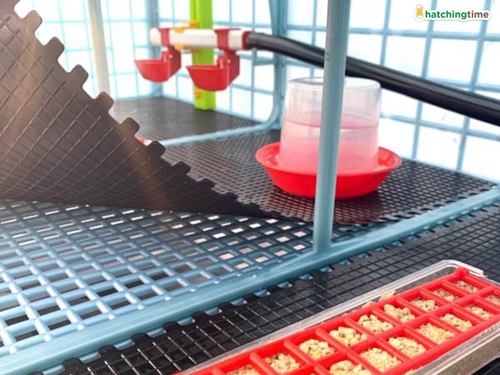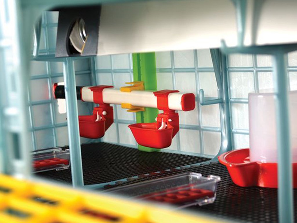 Součástí balení v každém patře jsou tři přenosné krmné misky pro první dny života mláďat a odchovna drůbeže je také vybavena závěsným velkokapacitním krmítkem pro zásobu krmení až na 2 dny pro každé mládě. Krmítka jsou vyrobena z kvalitního plastu, odolné proti nárazům a velice snadné k údržbě. Navíc jsou krmítka vybavena speciální mřížkou, která zamezuje mláďatům v rozhrabování krmiva, a tím nedochází k jeho plýtvání. Mřížka je navržena k přiměřenému pohybu při spotřebě krmiva.