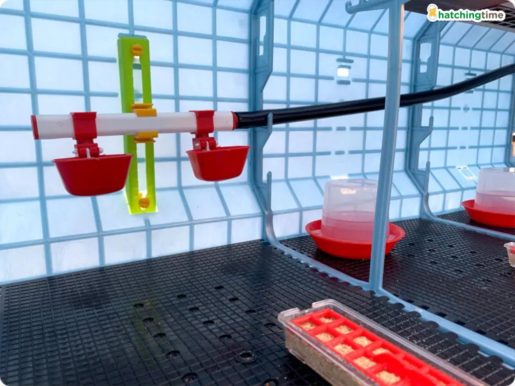 Odchovna je vybavena dvěma kloboukovými napáječkami pro první dny života mláďat a dvěma výškově nastavitelnými niplovými napáječkami, které poskytují bezproblémový a hygienický způsob napájení mláďat uvnitř klece. Součástí niplových napáječek jsou i přídavné misky na vodu, které tak vytváří kvalitní automatické napáječky a také zamezují mláďatům k jejich namáčení. Voda do automatických napáječek je přiváděna z průhledného zásobníku vody pomocí systému hadic. Zásobník proto nabízí dokonalý přehled o aktuálním stavu hladiny vody, jeho víko chrání vodu před znečištěním a také zajišťuje chovatelům snadné doplňování dle potřeby.