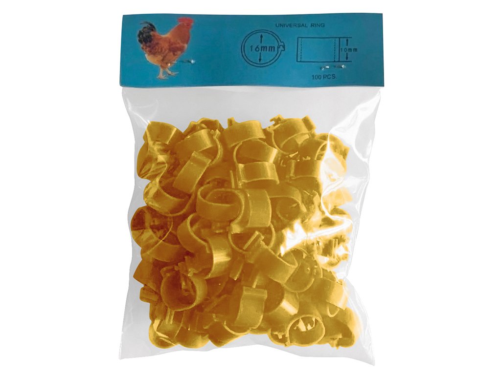Zámkový kroužek k orientačnímu značení slepic a kachen, průměr 16 mm, výška 10 mm, barva žlutá, v balení 100 ks.