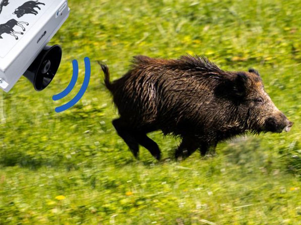 Zvukový odpuzovač divoké zvěře, napájení 230 V nebo 12 V baterie, chrání plochu až 7000 m2, reprodukuje velmi hlasité zvuky, vestavěný výkonový zesilovač, radarový senzor pohybu, s ochranou IP44, soumrakový režim, dálkové ovládání zařízení, různé režimy provozu, rozměry 22,5x16 cm.