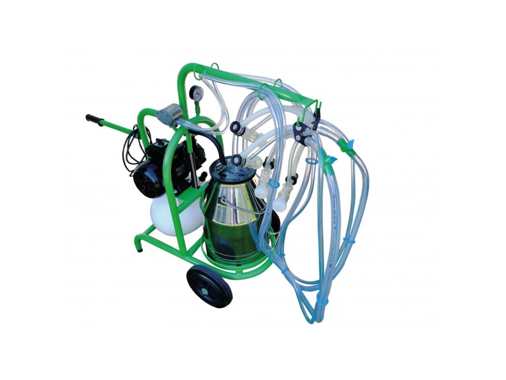 Mobilní dojička na kozí mléko pro strojní dojení koz se dvěma dojícími jednotkami. Přístroj je vhodný k použití v chovech o menším počtu koz, nebo pro hobby chovatele. Dojička funguje na principu sběrače a pulzátoru, přičemž stabilní podtlak s rezervou zabezpečuje vzdušník.