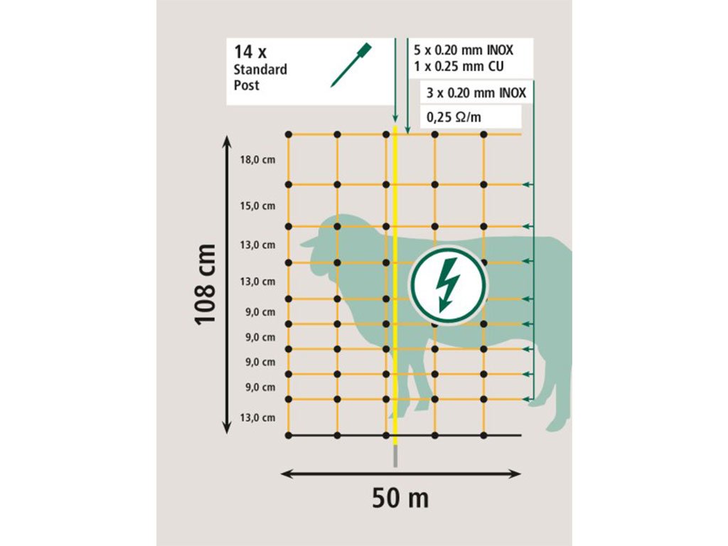 Ohradníková vodivá síť pro ovce, pro konstrukci elektrického ohradníku, 10 vodorovných pramenů, zesílený horní pramen až s 6 vodiči, spodní pramen bez vodiče, ostatní vodorovné prameny se 3 vodiči, 14 plastových tyček s 1 hrotem, pevně svařené spoje a odolné zarážky, výška 108 cm a délka 50 m.