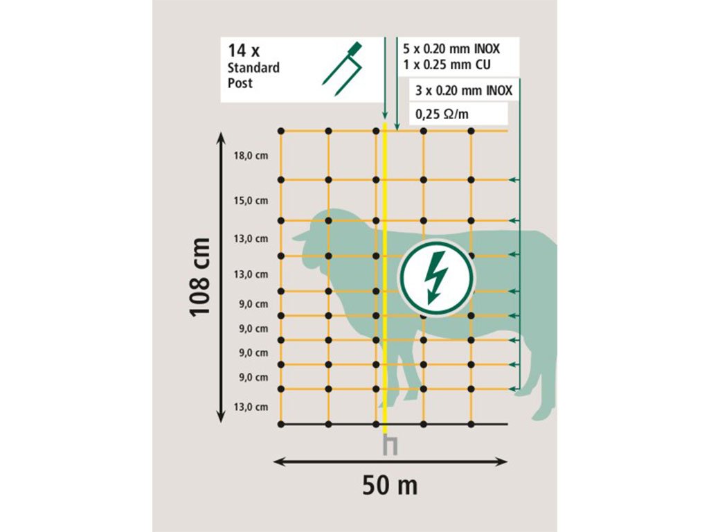 Ohradníková vodivá síť pro ovce, pro konstrukci elektrického ohradníku, 10 vodorovných pramenů, zesílený horní pramen až s 6 vodiči, spodní pramen bez vodiče, ostatní vodorovné prameny se 3 vodiči, 14 plastových tyček s dvojitým hrotem, pevně svařené spoje a odolné zarážky, výška 108 cm a délka 50 m.