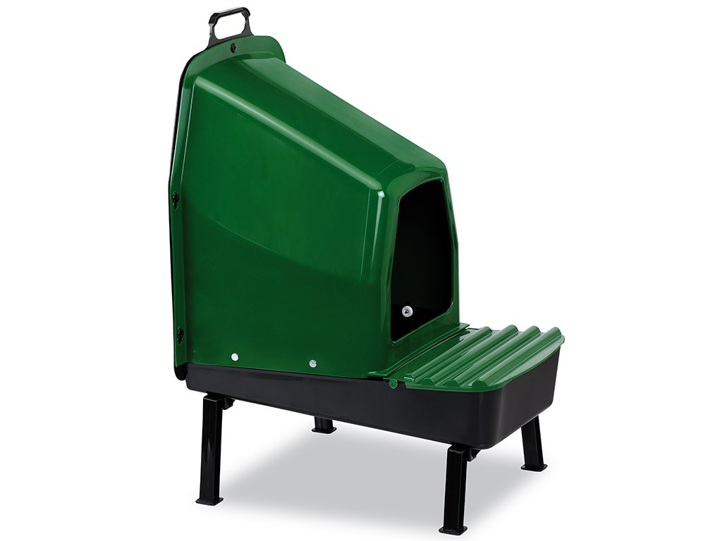 Snáškové hnízdo pro slepice se sběrným košíkem na vejce, na nožičkách, kapacita až pro 5 nosnic na jednu kukaň, dno hnízda je spádované, vejce se samo odkutálí do košíku s kapacitou až na 10 vajec, vyrobené z plastu, barva zelená. Jednoduché umístění na zem, velice snadná údržba čistoty, rozměry 44cm délka (28cm bez košíku) x 37cm šířka x 63cm výška.