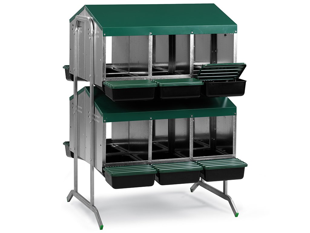 Snáškové hnízdo pro slepice se sběrným košíkem na vejce 12-místné na nožičkách, kapacita až 60 nosnic (5 nosnic na jednu kukaň), dno hnízda je spádované, vejce se samo odkutálí do sběrného košíku, vyrobené z pozinkovaného kovu s plastovým dnem, barva zelená. Hnízdo můžete jednoduše postavit v kurníku na zem, velice snadná údržba čistoty, rozměry: 105,5 cm délka x 82,7 cm šířka x 121 cm výška.