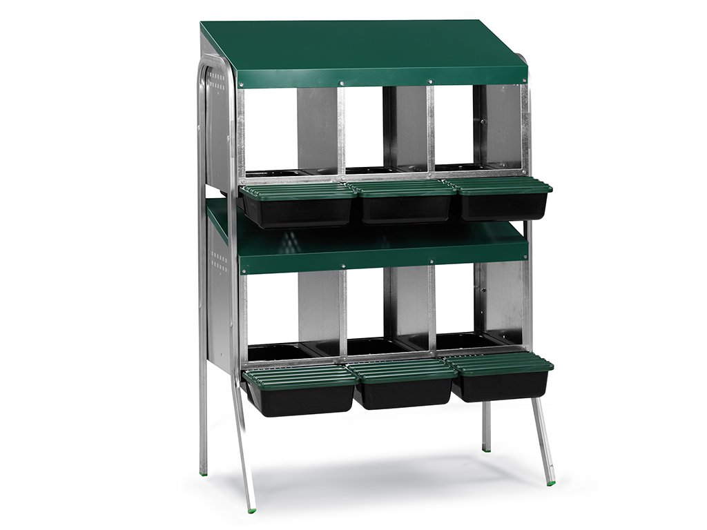 Snáškové hnízdo pro slepice se sběrným košíkem na vejce 6-místné na nožičkách, kapacita až 30 nosnic (5 nosnic na jednu kukaň), dno hnízda je spádované, vejce se samo odkutálí do sběrného košíku, vyrobené z pozinkovaného kovu s plastovým dnem, barva zelená. Hnízdo můžete jednoduše postavit v kurníku na zem, velice snadná údržba čistoty, rozměry: 52,2 cm délka x 82,7 cm šířka x 121 cm výška.