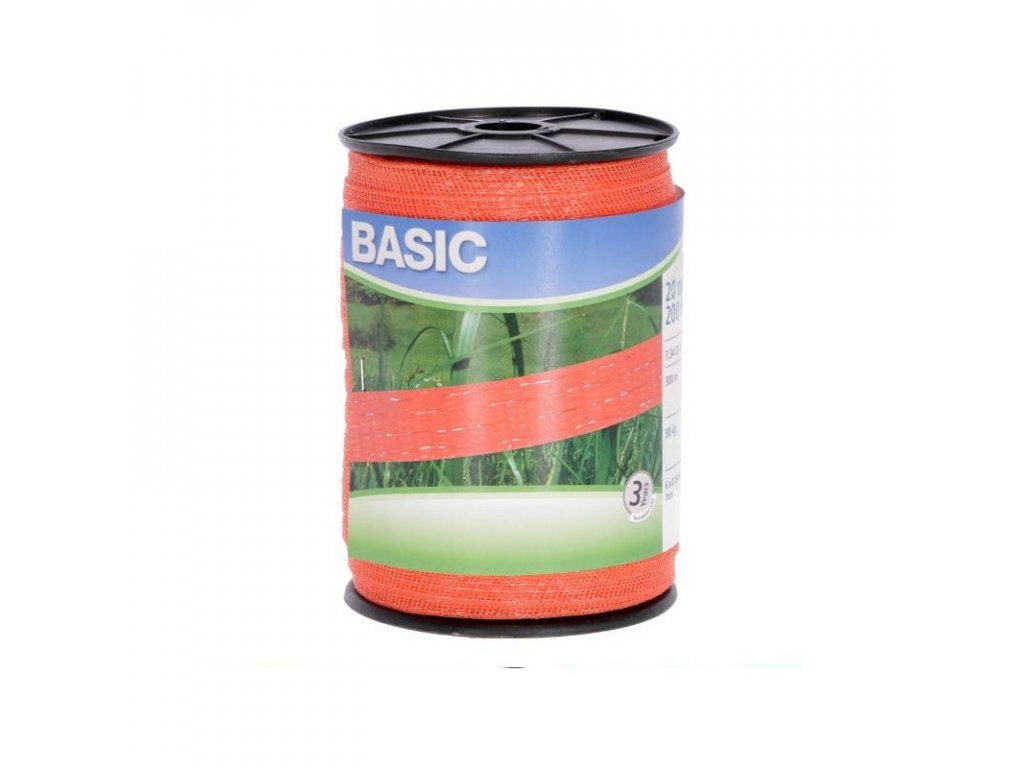 Páska BASIC pro el. ohradník, 20 mm x 200 m, 6x 0,16 mm, oranžová. Vodivá páska pro elektrický ohradník vhodná zejména pro ohrazení koní. Páska je díky své výrazné barvě velmi dobře viditelná.