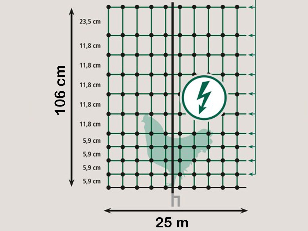 Ohradníková vodivá síť pro drůbež s výškou 106 cm a délkou 50 m, vhodná pro konstrukci elektrického ohradníku. Součástí balení je 15 pevných plastových tyček s dvojitým hrotem a 4 kotvící háky. Jedná se o ochrannou síť, která zamezí úniku slepic či jehňat a zároveň je ochrání před predátory.