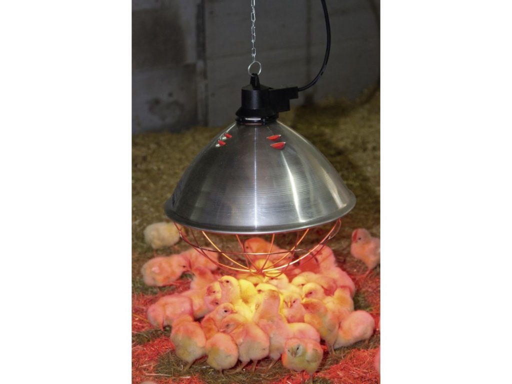 Infrazářič - výhřevná infralampa se širokým kloboukem pro výhřev selat, kuřat, jiných mláďat a terarijních zvířat. V drobných chovech může nahradit umělou kvočnu.