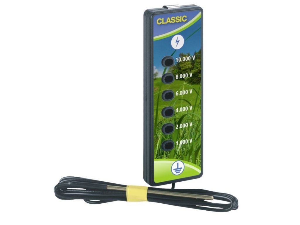 Jednoduchá varianta pro kontrolu ohradníku, uzemnění a zdrojů. Rozpětí od 1000 do 10000V. Kabel se zemnící tyčkou se zasune do země a svorka na zkoušečce se zavěsí na elektrický vodič ohradníku. Rozsvítí se dioda dle naměřené hodnoty.